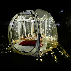 What’s Included: -Fully Styled Bubble Tent Elegant drapery, ambient fairy lights, and charming décor throughout. -Climate Comfort Portable heater to ensure a warm, cozy experience. -Luxury Bedding Plush bedding, a luxury blanket, and accent pillows for a comfortable space perfect for snuggling or stargazing. -Romantic Table Setup Candlelit décor, soft rose petal accents, and premium place settings. -Bottle of Champagne Chilled and ready for your celebratory toast. -Charcuterie Board Fresh fruit, assorted cheeses, crackers, and light bites. -Chocolate Chip Cookies Fresh and perfect for sharing. Entertainment Basket UNO, Connect Four, card games, Tic-Tac-Toe, and more. Snack & Drink Station Skinny Pop popcorn, crackers, etc., and two complimentary bottles of water. Bluetooth Speaker Connect your playlist to set the perfect romantic vibe. Delivery, Setup & Breakdown We handle everything from start to finish — all you have to do is arrive and enjoy.